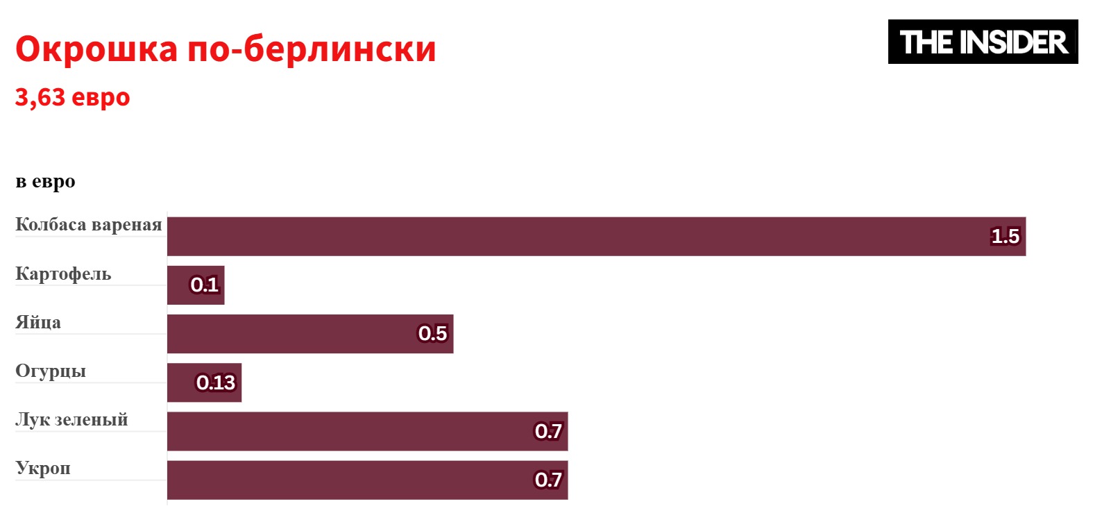 Итак, мы подошли к фирменному блюду, «международному индексу окрошки». Совсем недавно The Insider рассказывал о российском «индексе окрошки», помогающем рассчитать альтернативный индекс роста цен. Ежегодные расчеты публикует аналитический центр «Чек Индекс», и если ему верить, то набор подорожал на 14% за год.