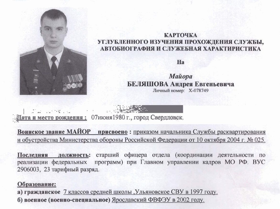 Так, например, в 2009 году Юлия Пушкарева, секретарша директора компании Ken-Group, посылает Грязнову учетную карточку сына директора — майора Андрея Беляшова, старшего офицера Главного управления кадров Минобороны.