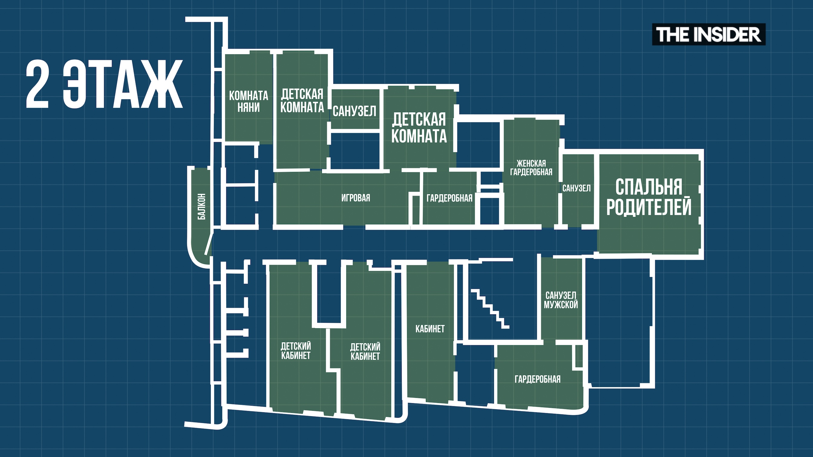 Главная спальня площадью 75 кв. м находится на втором этаже, куда можно попасть по шикарной винтовой лестнице. Рядом со спальней располагаются две гардеробные для Костина и Аскер-Заде и две отдельные хозяйские туалетные комнаты. Также тут есть двухметровое помещение под названием «хранилище украшений» и кабинет хозяина. На втором этаже находятся и две детские комнаты, два детских кабинета и отдельно — игровая комната. Над бассейном расположен спортзал площадью почти в 170 кв. м.