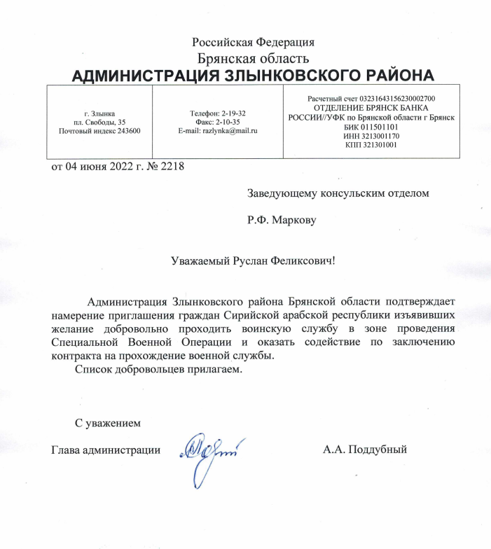 В распоряжении The Insider оказались письма заведующему консульским отделом МИД России Руслану Маркову, подписанные главами районных администраций Брянской области. Главы районов подтверждают намерение пригласить сирийцев, «изъявивших желание добровольно проходить военную службу в зоне СВО», и обещают содействие в заключении контракта с Минобороны.