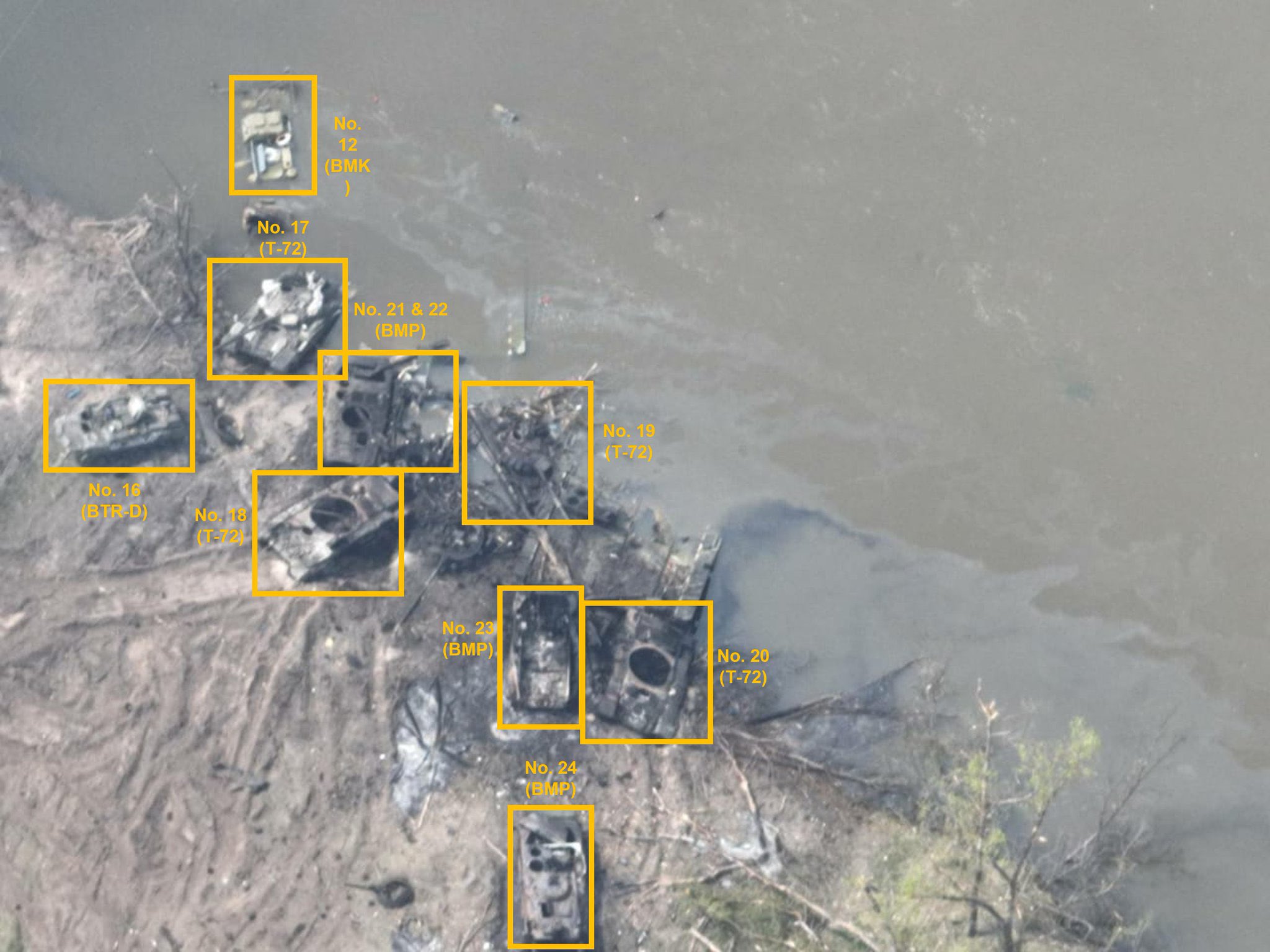За четыре дня Россия потеряла или бросила 73 единицы военной техники в результате неудачной переправы через реку Северский Донец в районе Белогоровки. Это выяснил расследователь BlueSauron, занимающийся освещением военных конфликтов на основе открытых данных.