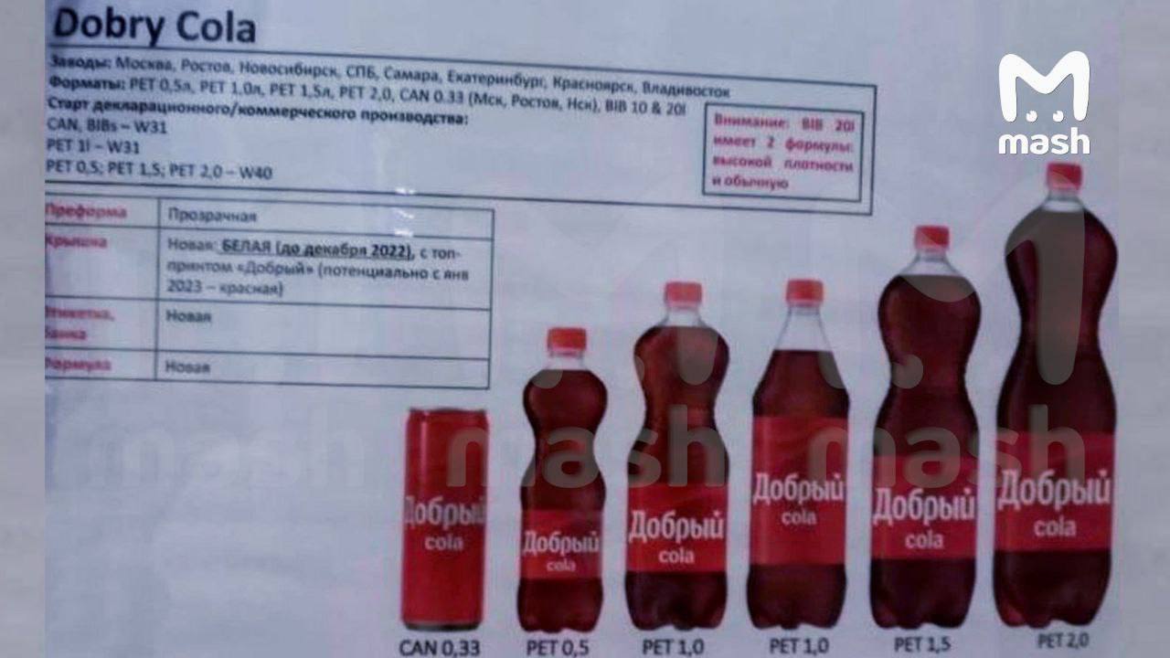 Coca-Cola в России после ухода компании-дистрибутора Coca-Cola HBC будет называться «Добрый Cola», также планируется поменять названия напитков Fanta и Schweppes и прекратить выпускать на время Sprite. Такое решение принял производитель напитков «Мултон» (часть российской Coca-Cola), сообщает Mash.