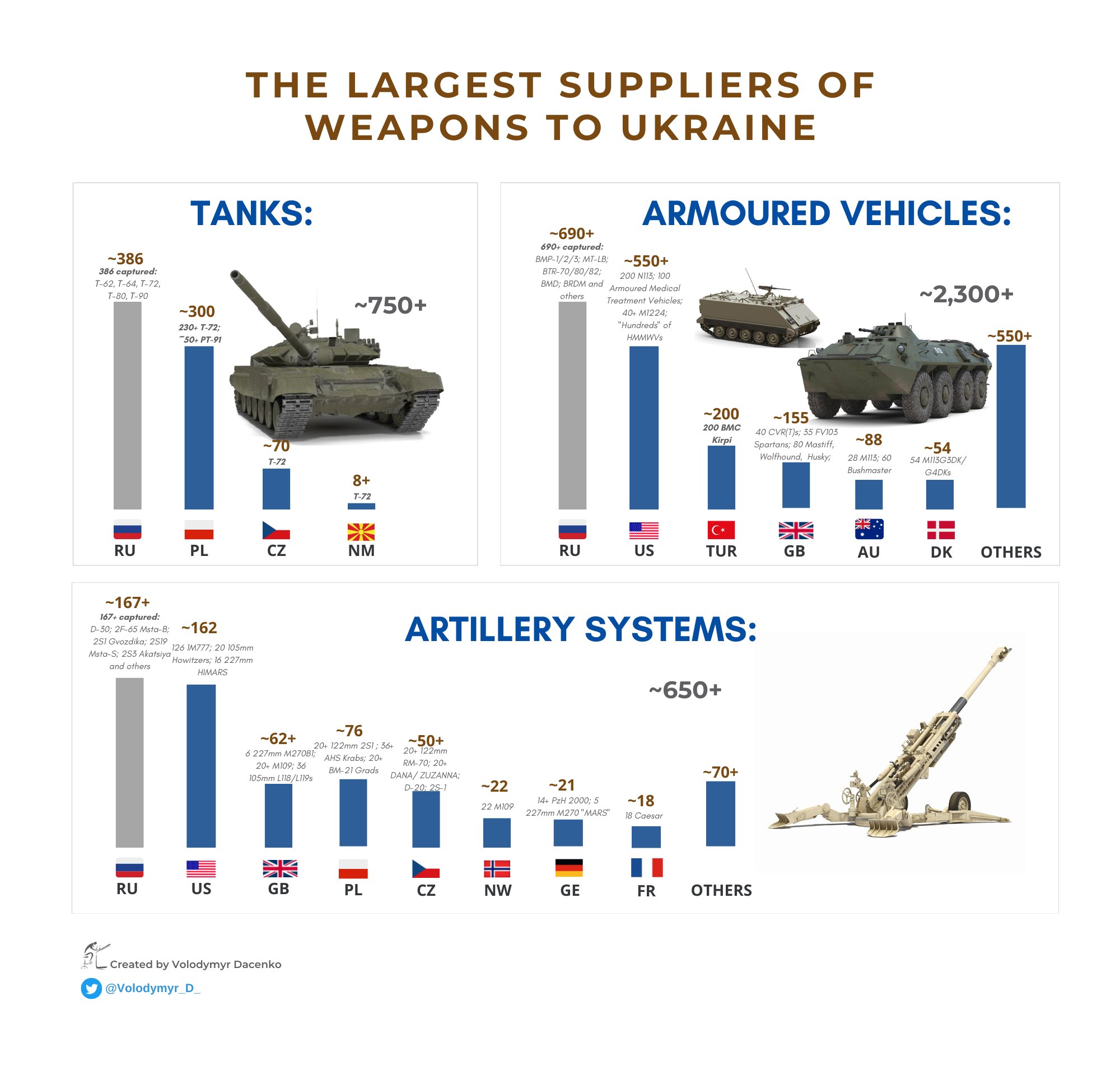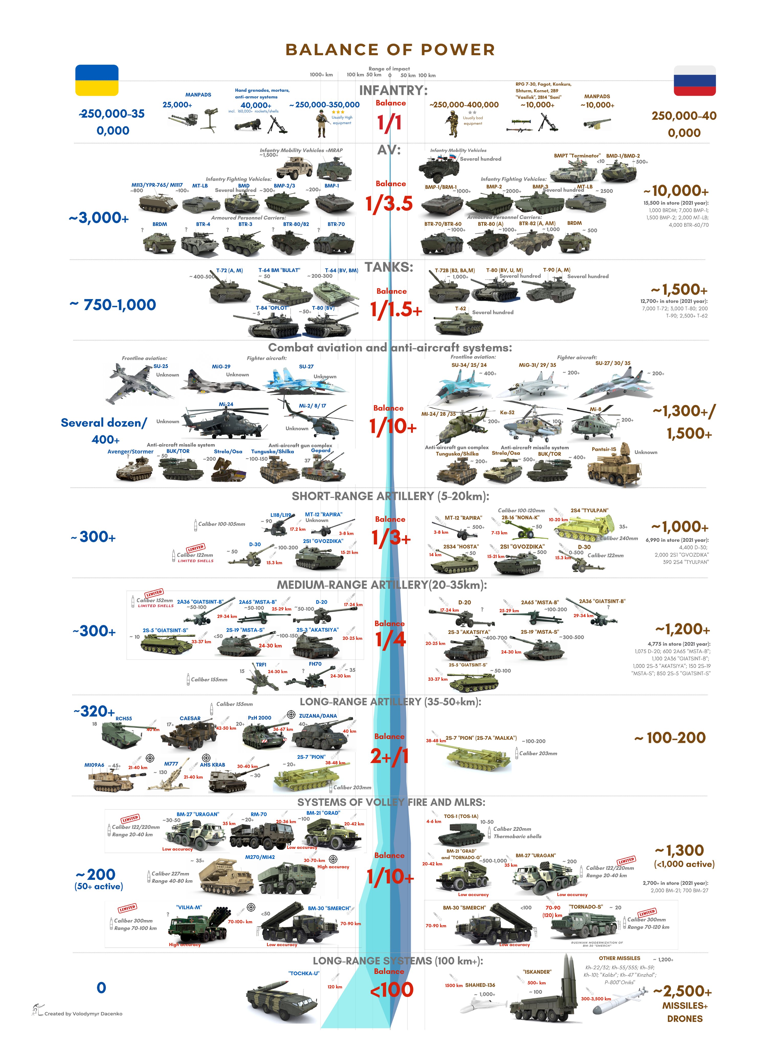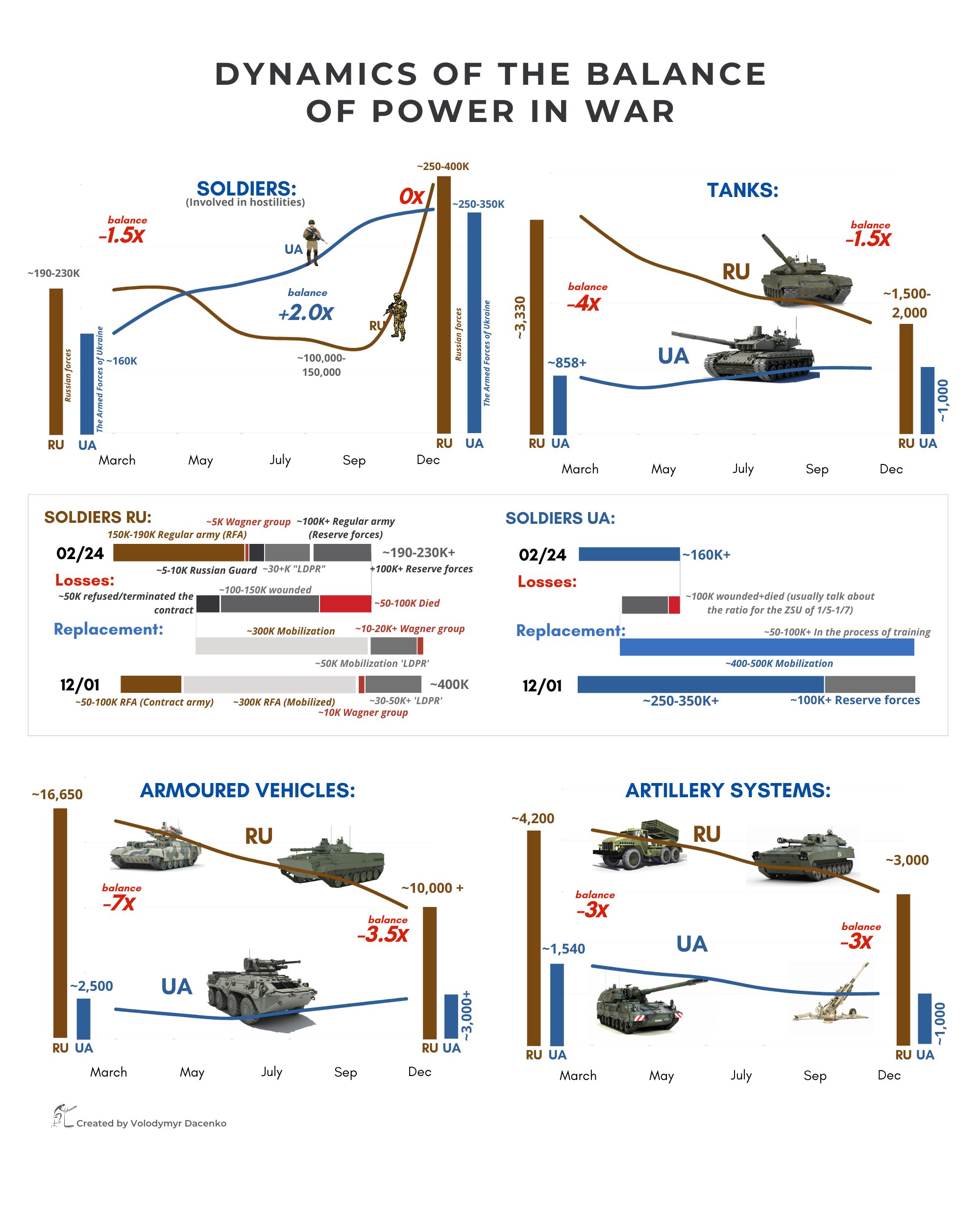 Обозреватель украинского издания Forbes Владимир Даценко публикует данные, собранные по открытым источникам, которые показывают, что ВСУ постепенно сокращает отставание от ВС РФ по основным показателям военной мощи, но у российской стороны по-прежнему огромное преимущество в технике, артиллерии и авиации. Россия несет большие потери, но Украина получает помощь от союзников, а также захватывает технику на фронте.