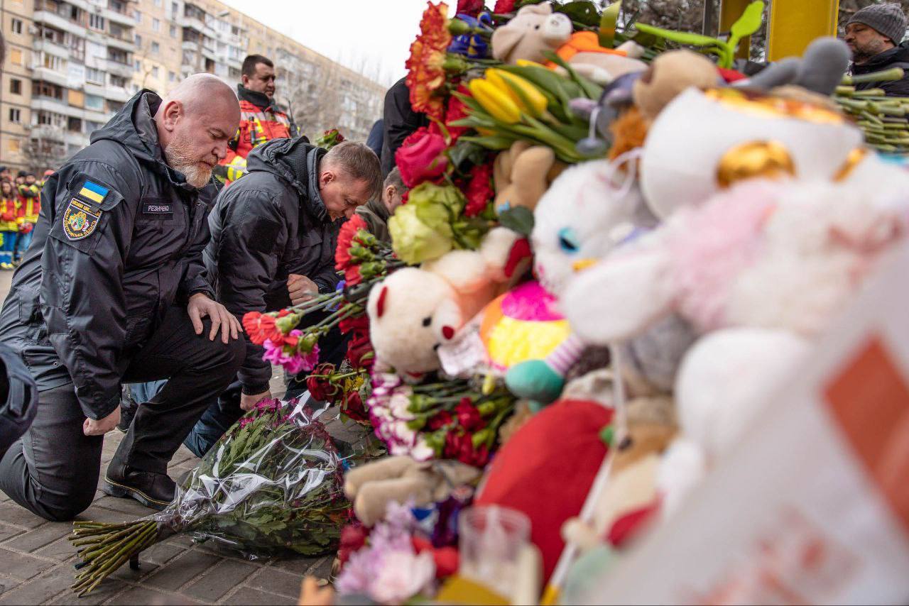 Число жертв увеличилось до 45, среди погибших шестеро — дети, сообщил глава Днепропетровской областной военной администрации (ОВА) Валентин Резниченко. Он опубликовал фото, на которых горожане и власти возлагают цветы.
