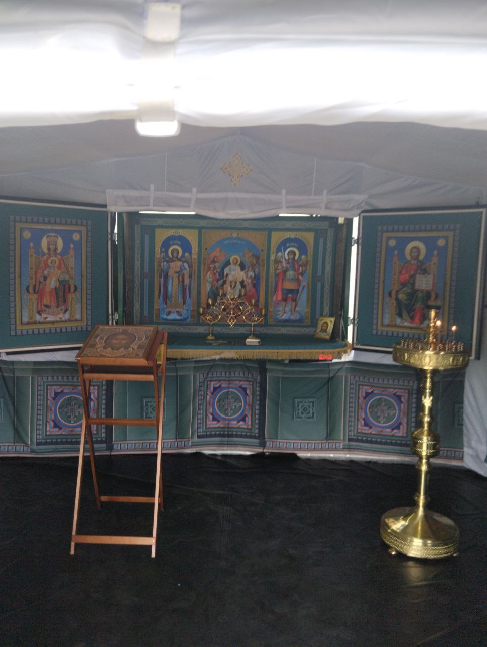 Мобильный храм с ликом Христа, буквами Z и V по бокам от него и надписью «За веру и отечество» представляет собой брезентовый шатер, в котором находится походный иконостас. Перевозится он на военном грузовике, обклеенном распечатанными иконами.