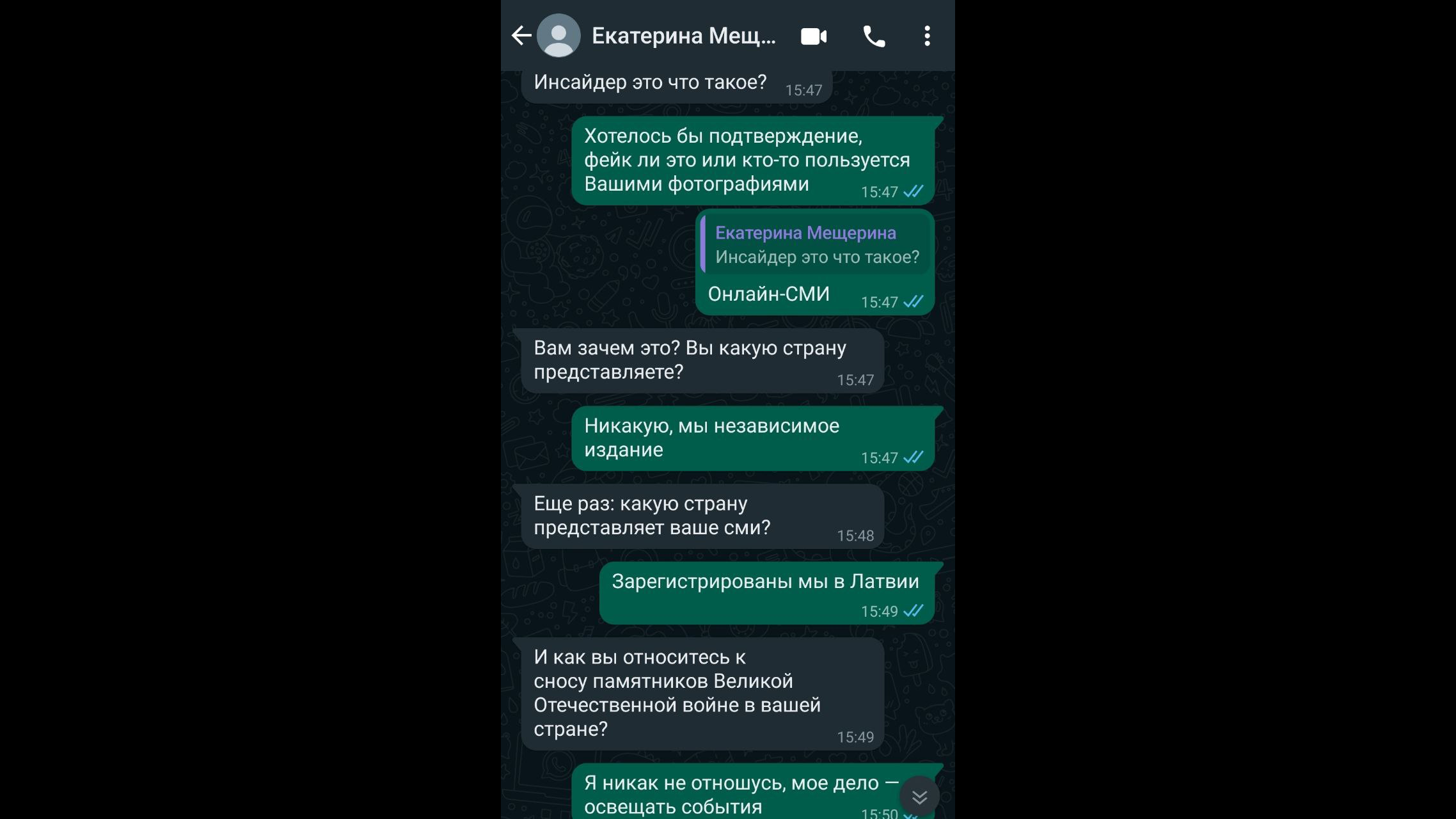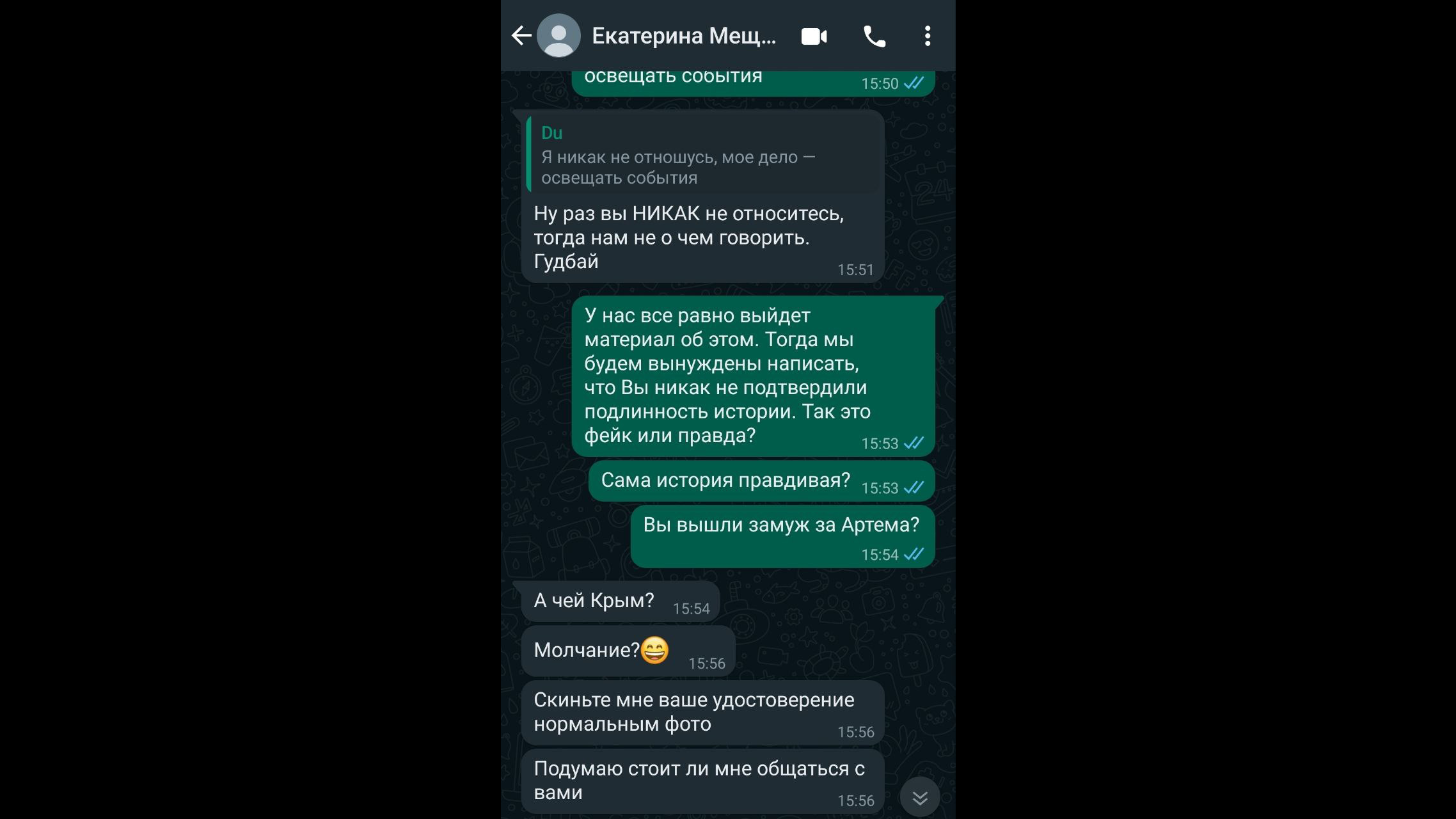 Когда корреспондент The Insider попытался связаться с ней по телефону и спросил, действительно ли она вышла замуж за человека, которого в «Победе любви» представляют Артемом, она сказала: «Это что, шутка какая-то?» — и повесила трубку. Затем с Мещериной состоялся следующий диалог в мессенджере WhatsApp, после чего она внесла корреспондента в черный список: