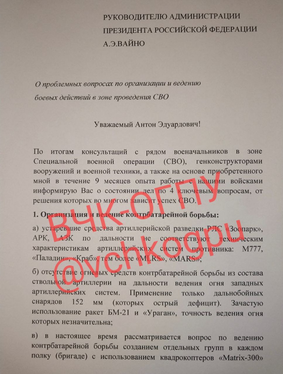 Telegram-канал «ВЧК-ОГПУ» опубликовал якобы докладную записку бывшего главы «Роскосмоса» и бывшего «оборонного» вице-премьера Дмитрия Рогозина на имя руководителя Администрации президента Антона Вайно. Если верить тексту документа, то российской армии не хватает буквально всего: