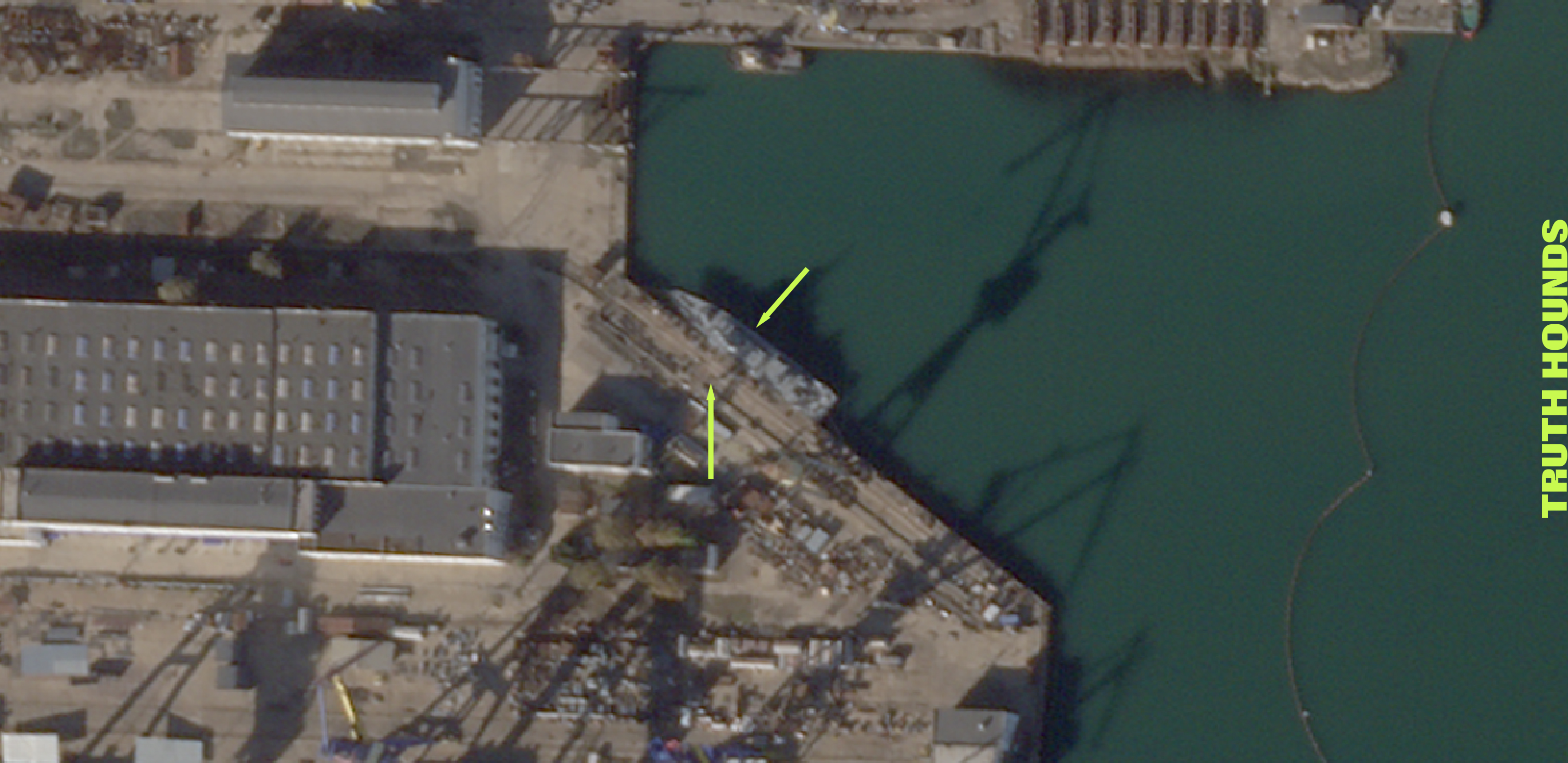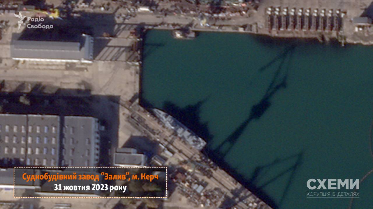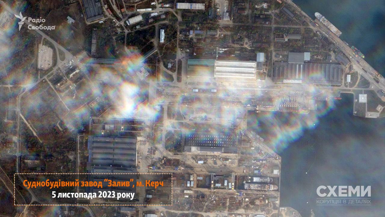 Проект Truth Hounds также публикует спутниковые снимки доков завода «Залив». На снимках за 5 ноября видно, что произошло как минимум одно попадание по кораблю, а для ликвидации последствий перемещен один кран.
