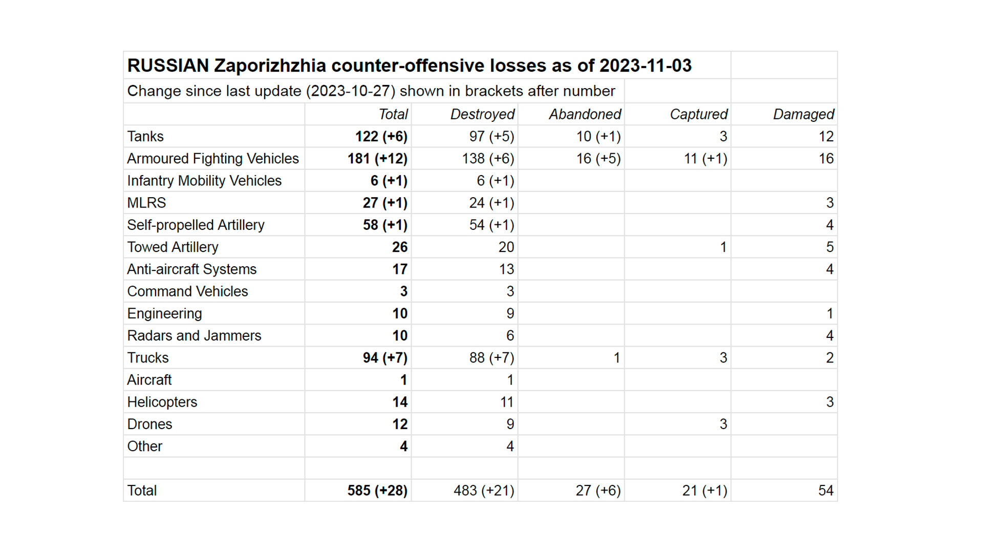Аналитик под ником Naalsio обновил подсчеты потерь вооружений и военной техники ВСУ и ВС РФ на запорожском направлении, где в последние пять месяцев развивалось украинское наступление. По его данным, за это время ВСУ потеряли не менее 507 единиц техники (474 без учета беспилотников и грузовиков), ВС РФ — 585 единиц (479 без учета беспилотников и грузовиков). За неделю подтвержденные потери техники составили 15 единиц для ВСУ и 28 для ВС РФ.