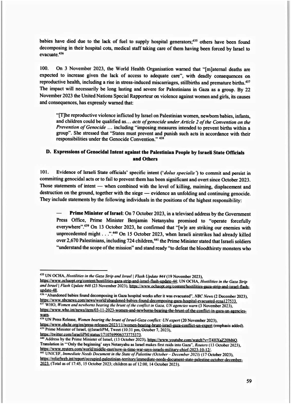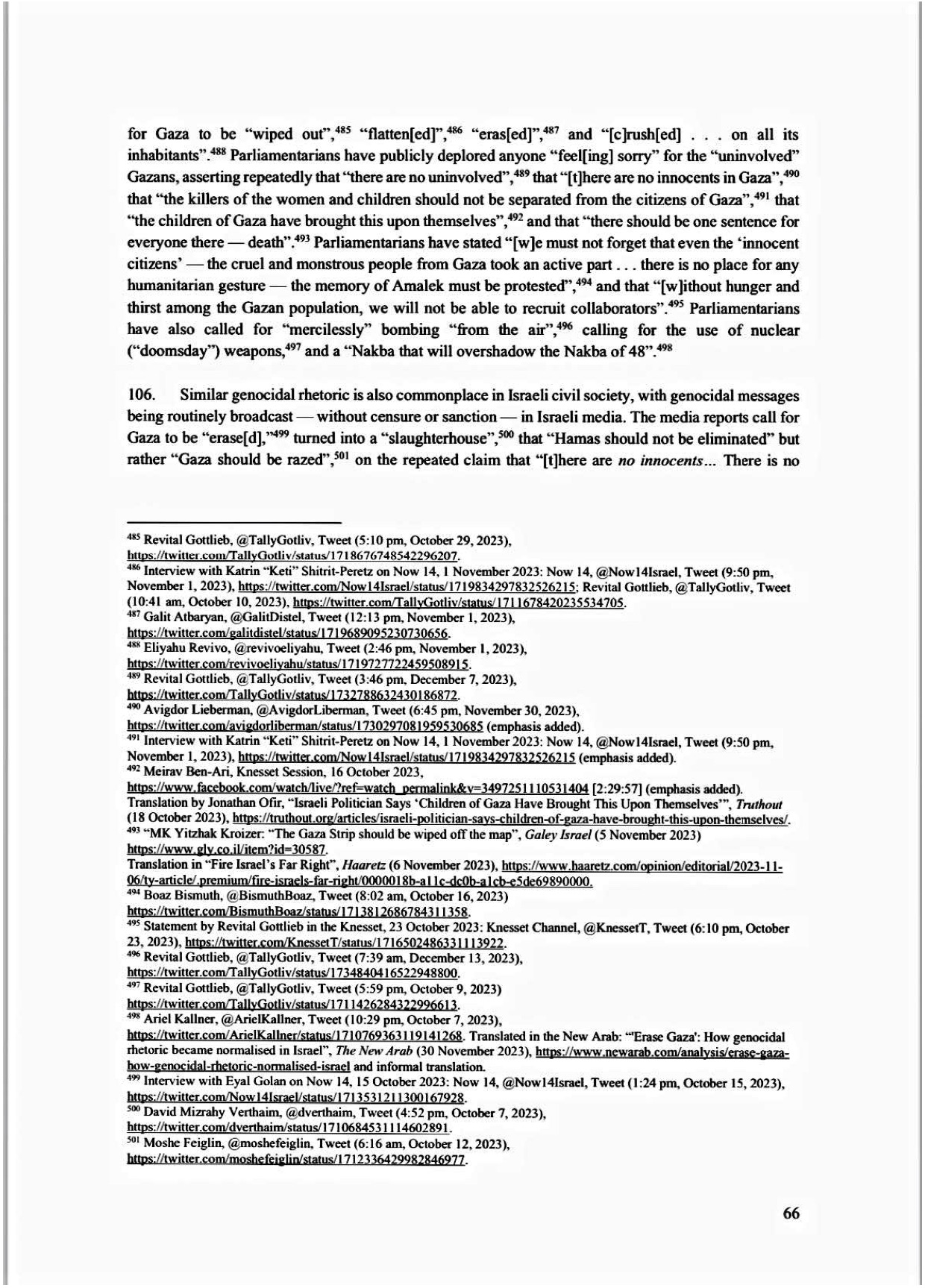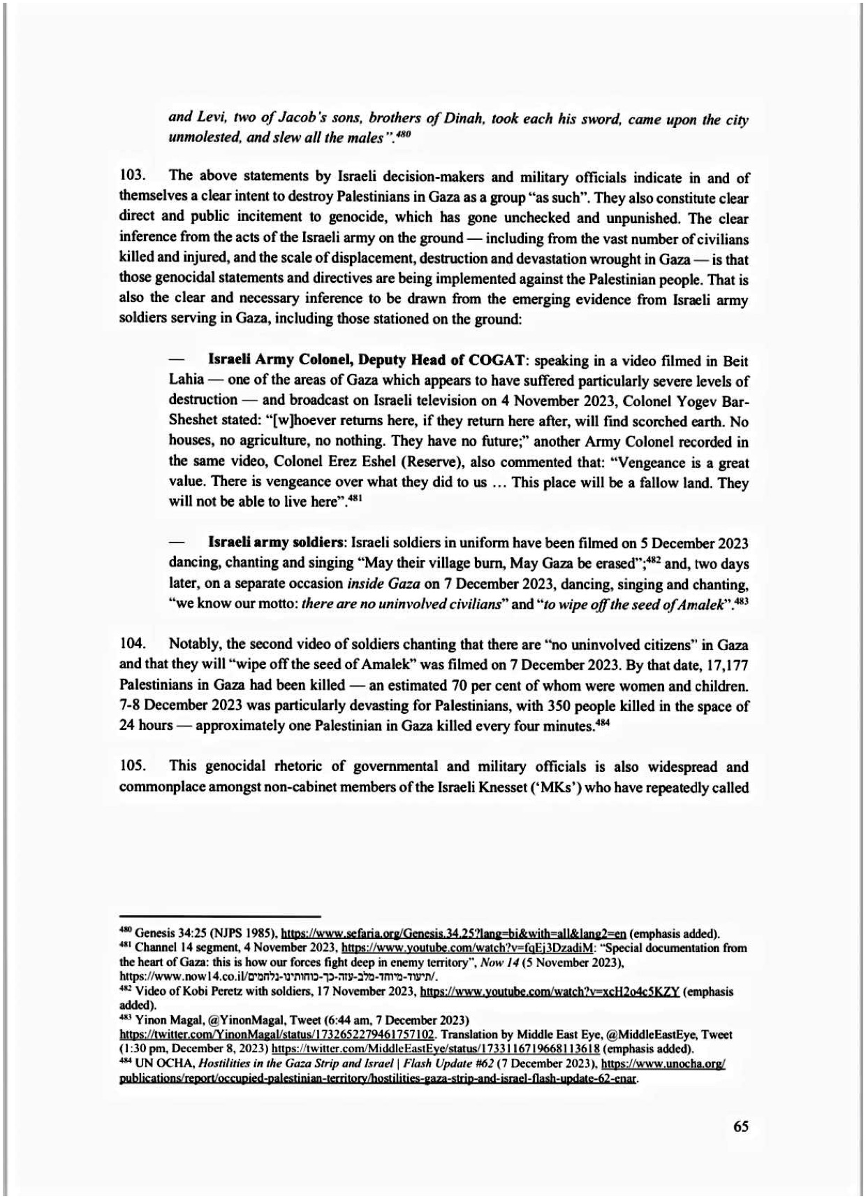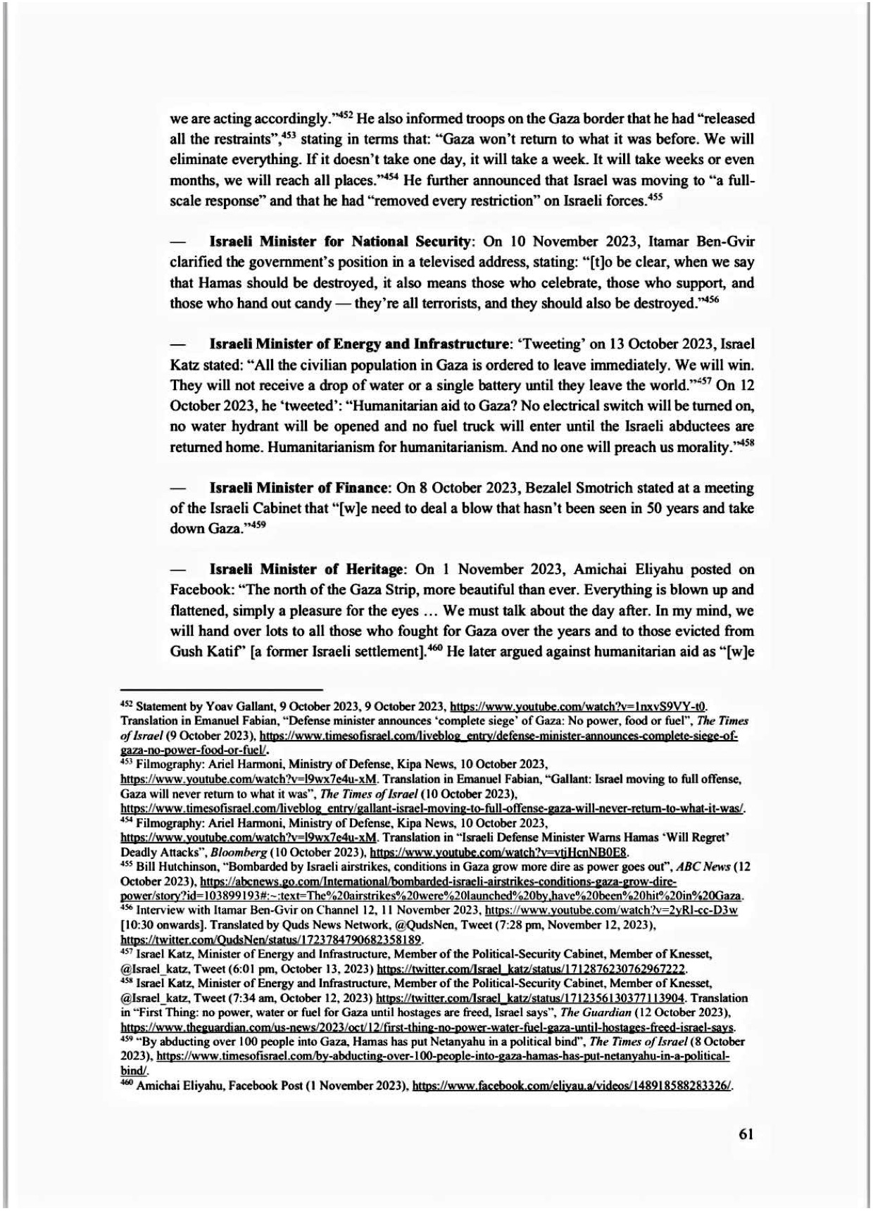 Наконец, всё это делается под лозунгами, доказывающими геноцидальный умысел: „Мы воюем с Амалеком”, „В Газе нет невинных людей”, „Дети Газы сами навлекли на себя это”, „Мы уничтожим Газу”, „Мы уничтожаем человекоподобных животных” и т.д. Всё это высказывания руководителей Израиля: от президента и премьер-министра до министров и членов Кнессета. Еще больше этого мы слышим от беснующихся израильских военных, хвастающих своими „подвигами” в многочисленных видео. Кроме того, должностные лица Израиля вслух говорят о намерении „освободить” Газу от населяющих ее палестинцев. Если всё это не геноцид, то что такое геноцид?