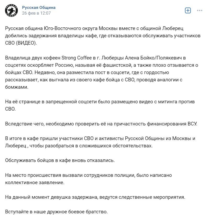 Скриншоты этого поста опубликовал у себя в Telegram-канале создатель экстремистского неформального объединения «Мужское государство» Владислав Поздняков. К преследованию владелицы кафе подключилось движение «Русская община», которое опубликовало видео с мужчинами в камуфляже, которые заходят в несколько кафе в Люберцах, первое заведение оказывается закрытым, во втором активисты движения берут книгу жалоб и предложений. После чего показаны кадры общения с силовиками. Активисты говорят, что их отказались обслуживать в кафе, и просят провести проверку в отношении владелицы.