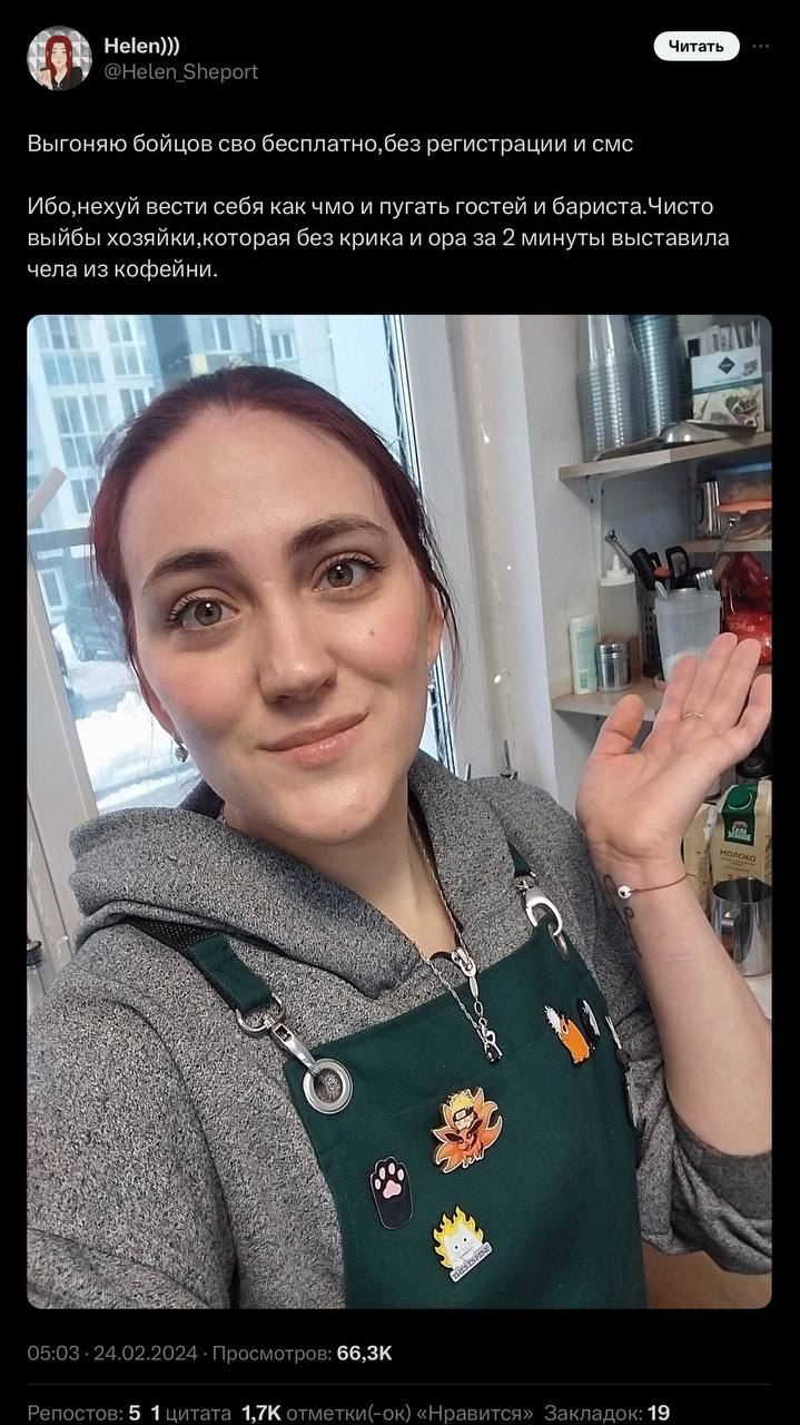 «Бариста не знала, что делать с ним в течение часа, на нее он не реагировал примерно никак, решила написать мне. Я пришла и за две минуты уладила эту ситуацию. Без крика, без мата и прочего, просто попросила покинуть помещение. Бомжей я уже выгоняла, а теперь и горе-бойцы есть в моем списке», — написала Полякевич.