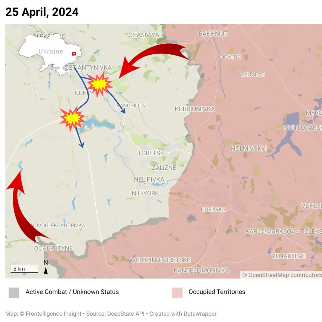 Исследователь Naalsio обновил данные по визуально подтвержденным потерям техники в Покровском районе (имеется в виду операционный район к западу от Авдеевки) и в районе Крынок на левом берегу Днепра. В Покровском районе, по его подсчетам, россияне за неделю с 19 по 26 апреля потеряли как минимум 25 единиц техники (в том числе 10 танков и 13 ББМ), подтвержденные потери техники ВСУ увеличились на 1 единицу. Под Крынками же подтвержденные потери сторон за тот же период составили 2 единицы техники для ВС РФ и одну — для ВСУ.