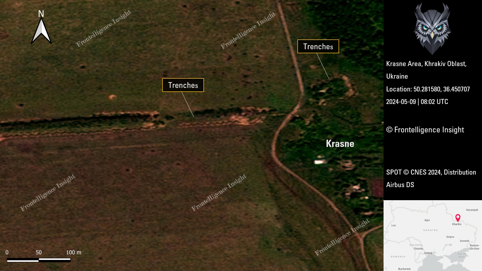 Tatarigami_UA подробно рассматривает один частный вопрос, касающийся отсутствия ИФС в районе продвижения российских войск на севере Харьковской области. При помощи спутниковых снимков исследователь показывает, что рядом с селами Красное и Глубокое по направлению на сам Харьков имелась система траншей и укреплений, а вот по направлению на Волчанск фортификационных сооружений оказалось гораздо меньше.