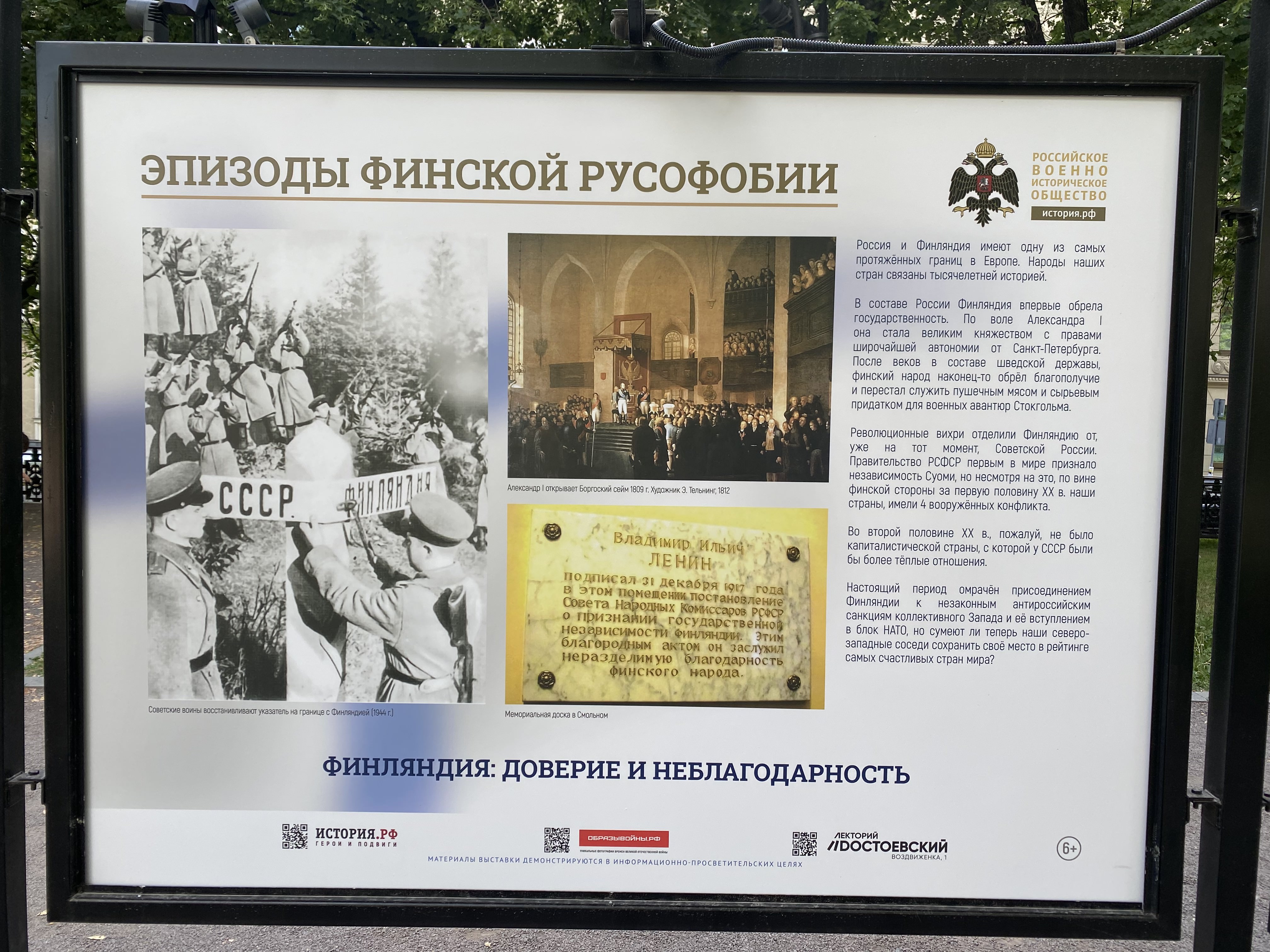 В Москве на уличных стендах проходит выставка Российского военно-исторического общества (РВИО) под названием «Эпизоды финской русофобии». В материалах выставки Финляндию называют «жалкой колонией Швеции», которая получила все права и свободы только после присоединения к России, а также рассказывают, что виновниками массовых расстрелов в Сандармохе были финны, а вовсе не НКВД.