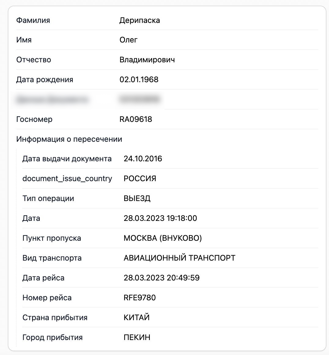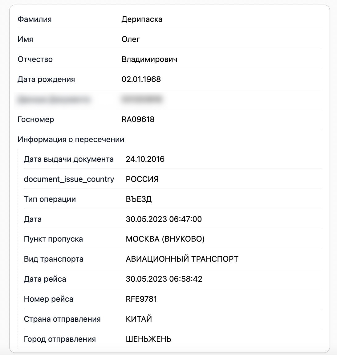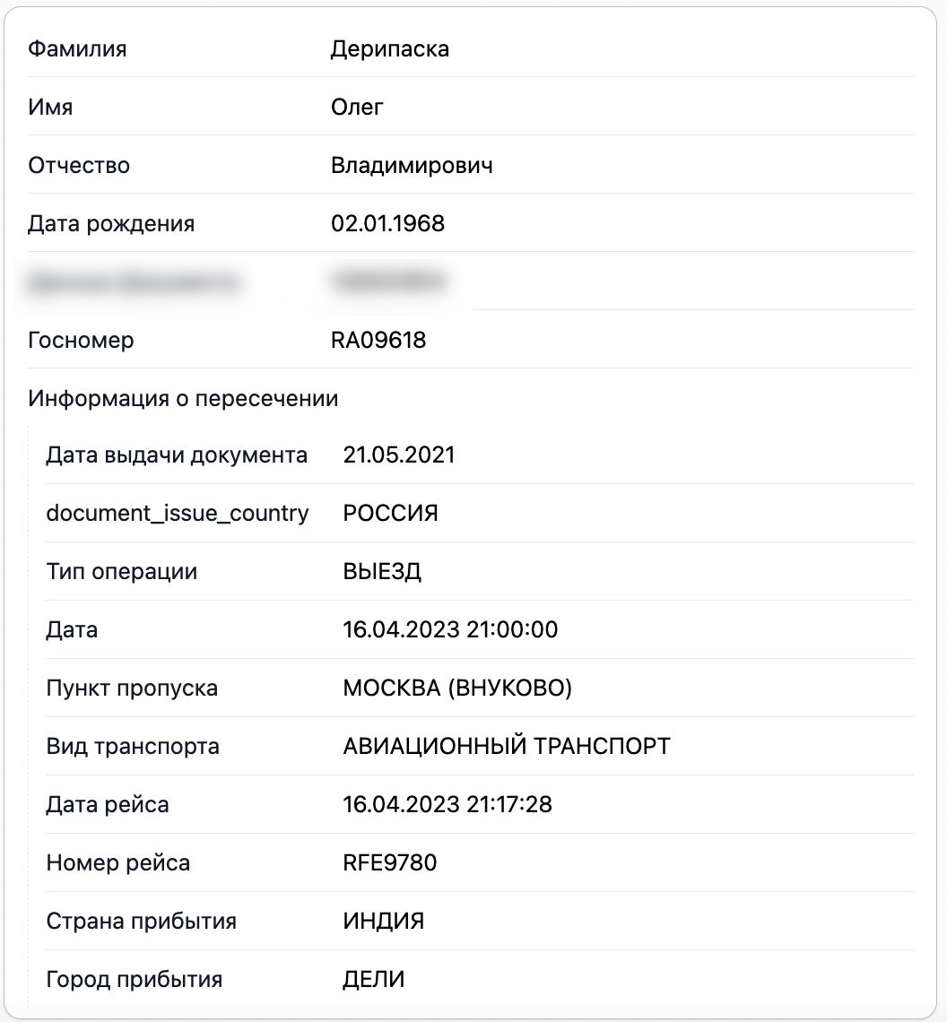 Присутствие Дерипаски на борту во время этих перелетов доказывают данные погранслужбы ФСБ, которые есть в распоряжении The Insider.