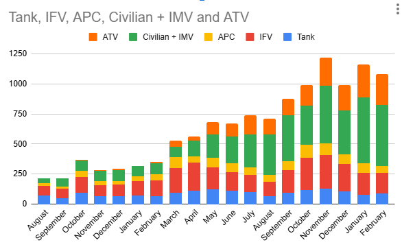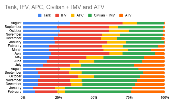 Исследователь под ником Andrew Perpetua публикует инфографику визуально подтвержденных потерь российской техники на фронте, начиная с августа 2023 года: если тогда почти 80% потерь приходилось на танки, БМП и БТР, то сейчас около 70% занимают гражданский транспорт и MRAP.