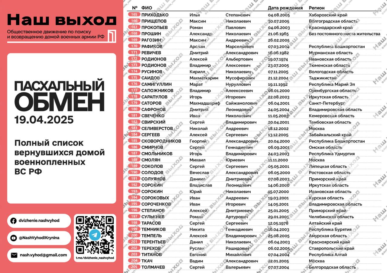 Поименный список вернувшихся домой российских военных опубликовал проект «Наш выход». В посвященном обмену посте в Telegram-канале движения рассказывается история Ярослава Мищенко, которого командование объявило погибшим и даже предлагало родственникам забрать тело, но благодаря проекту семья смогла найти его в плену.