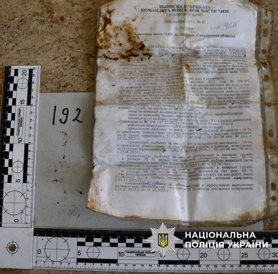 «Труп №192/25. Одет в форму образца вооруженных сил России. При нем — паспорт гражданина РФ, военный билет, талон аттестата военнослужащего № 1252, выписки из приказа командира в/ч № 52 от 26.12.2023, жетон с надписью: “ВС РОССИИ МТ-146004”»