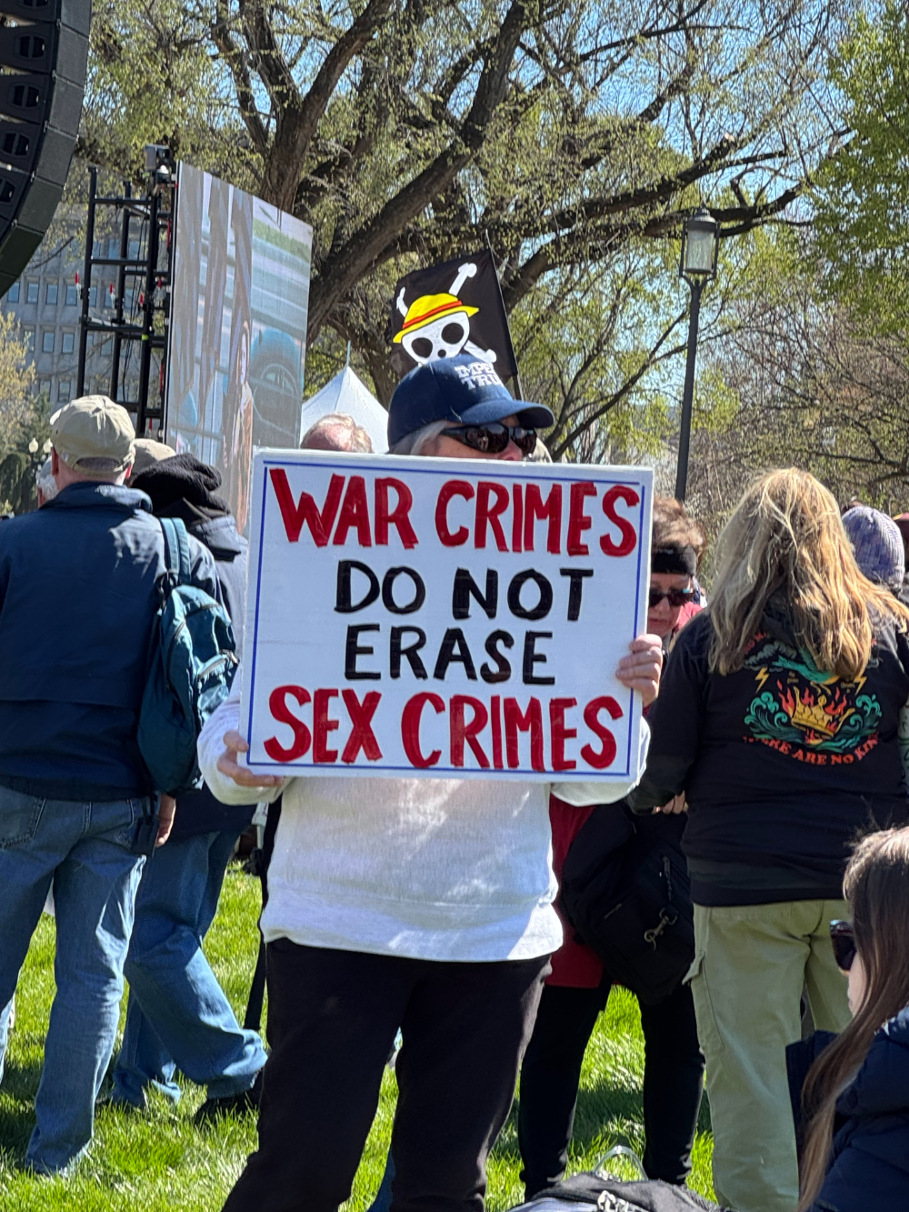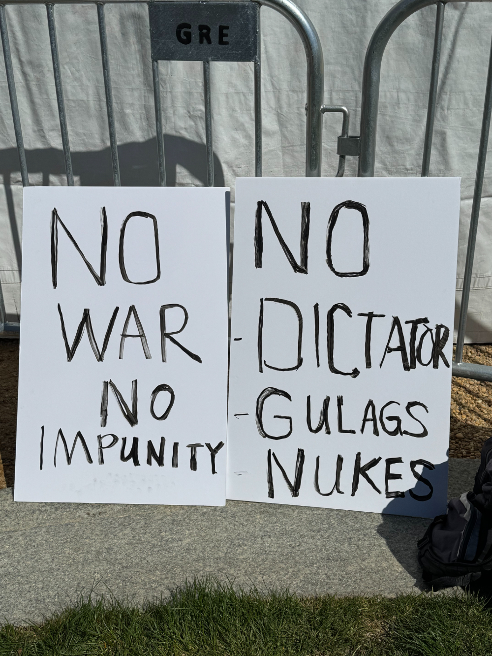Транспаранты отображали это разнообразие: «Нет войне, нет безнаказанности», «Нет диктатору и ГУЛАГам», «Военные преступления не отменяют сексуальных преступлений», «Руки прочь от наших соседей-иммигрантов», «Настоящие преступники — в Белом доме».
